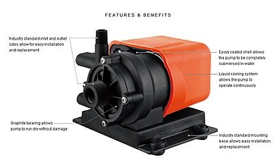 The SEAFLO Magnetic Circulation? pump is a centrifugal magnetic drive pump, eliminating the need for a shaft seal. Pumps are serviceable with a screwdriver. The pump is able to be run fully submerged or in open air for complete moisture protection. It also can pump liquids with a specific gravity greater than water, have a higher viscosity.