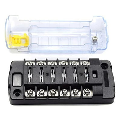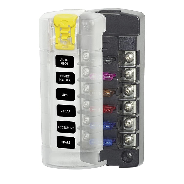 Fuse Block ST Blade 6 Circuit Independent with Cover, , is an independent source fuse block that consolidates branch circuits and eliminates in-line fuses Max Amps: 30A per circuit, 40A per jumped circuit group, Max Volts: 32V DC, Mounting: #8 Screw (M4), Screw Terminal Torque: 18in-lb, Screw terminal type: #8-32 screws with captive star lock washer Corrosion resistant, tin-plated copper fuse clips reduce heat and improve the efficiency of the electrical system Clear insulating cover with label recesses and storage for two fuses, satisfies ABYC/USCG insulation requirements and has a push button latch that is easy to open
