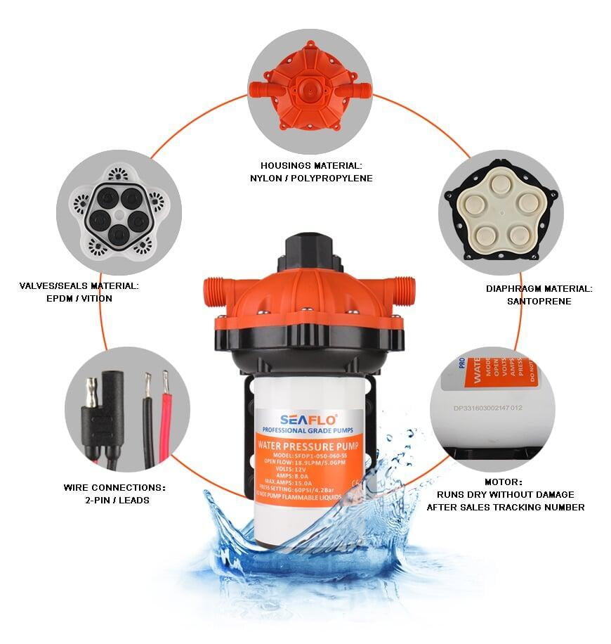 The 55 Series is our Heavy-Duty water pump. It provides high volume water flow with reduced pump cycling, thanks to the large five-chamber diaphragm. These models are designed to run on water systems with no accumulator tank necessary, and up to five fixtures! It is also suited for use with a holding tank water system, as may be found in a boat, RV or remote cabin. It provides up to 5.0 gallons per minute. The 55-Series pumps are self-priming, and can run dry without damage, performance reliable and low current. With a built-in bypass function, the 55 series is able to reduce rapid cycling and not allow water to flow back from the outlet side to the inlet side of the pump. This automatic demand water system pump has a built-in pressure switch, which automatically starts and stops the pump when the faucet is opened and closed.They are easy to install service and winterize.