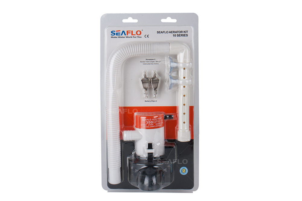SEAFLO Aerates from 5 to 30 gallons (19 to 113 liters) of water. The SEAFLO 350 GPH (1325 LPH) pump attaches easily to any non-porous surface. 6.3” (160mm) long spray tube, 13.8” (350mm) hosepipe can be custom cut to fit into any container.The kit also includes battery clips for easy attachment to your 12 volt power source.