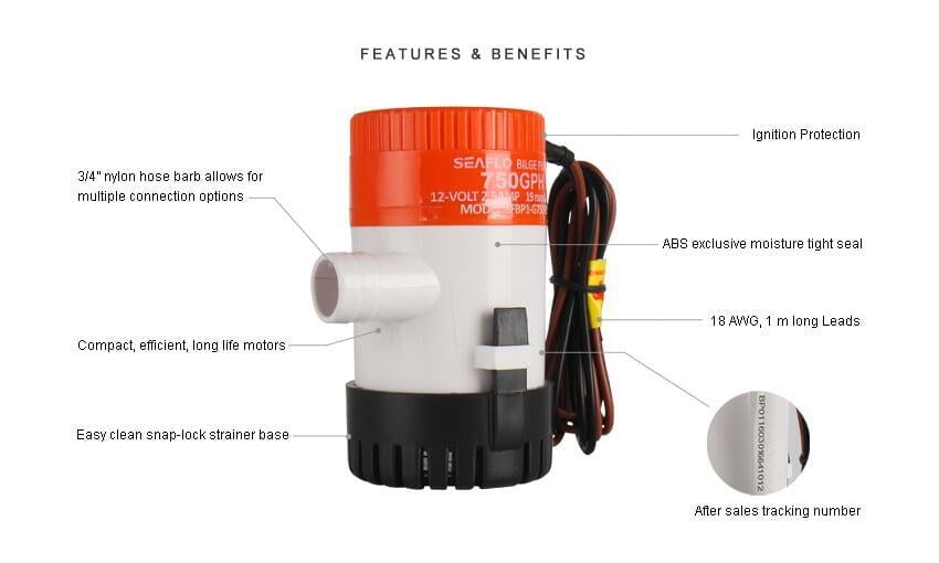 SEAFLO 12V Electric Marine Submersible non-automatic 750GPH bilge pumps offer water evacuation activated by a panel or float switch. Include Anti-Airlock protection and exclusive moisture tight seals,marine grade blockd wiring.Our larger impeller design and more robust motor allow us to outperform our competitors. Our removable strainer base fits industry standard mounting conventions though, so you’ll have no problem changing to us from them.